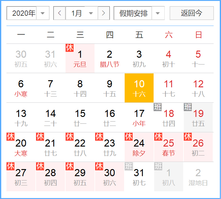 根據(jù)國家放假規(guī)定及結合本公司實際情況,經(jīng)公司研究決定,2020年春節(jié)放假時間為: 1月20日(周一)至1月30日共11天,1月31日初七上班;其中 1月18日(周六)補班(公司規(guī)定),1月19日(周日)補班(國家規(guī)定)、2月1日(周六)補班(國家規(guī)定)。